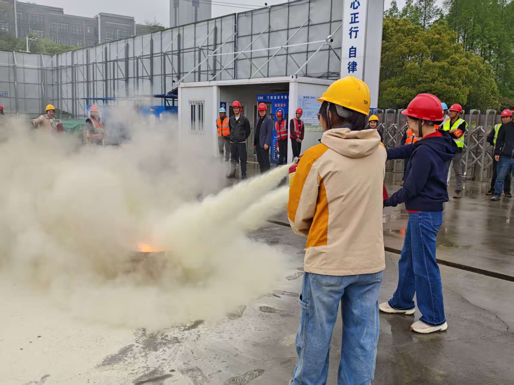 本次演练以油盆火模拟施工现场火情,重点开展灭火器实操训练。演练前,总指挥对灭火器使用方法、适用场景及安全注意事项进行详细交底。随着演练开始,现场模拟火情点燃,参演人员按规范操作,依次完成初期火灾扑救,全程规范有序、处置高效。