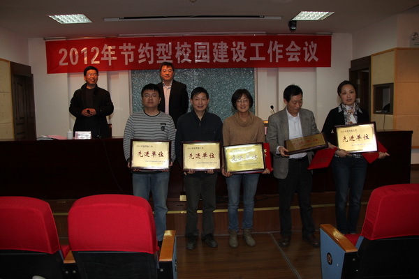 房产管理处处长潘吉仁(兼节约型校园建设与管理工作小组副组长)主持会议。房产管理处处长助理王强(兼节约型校园建设与管理工作小组秘书)作了江南大学2011年度节约型校园工作报告。大会表彰了2011年度节能工作先进单位和先进个人。党委组织部、生物工程学院、数字媒体学院、环境与土木工程学院、工会等5个单位荣获“2011年度节能工作先进单位”。祖晓慧(财务处)、陆志宏(青山湾管委会)等10名同志荣获“2011年度节能工作先进个人”。校党委书记武贵龙为获奖单位和个人颁发了奖牌和证书。会上,先进单位代表和先进个人代表先后发言,介绍了各自在节能减排方面所做的工作和心得体会,并就如何更好地推进节能工作提出了一些建设性的建议。其中,节能先进单位代表校工会的叶春标老师提出:节能关系到人类生存与社会发展,为此,他向在场老师介绍了他们“二无一少”的办公模式---无纸办公、无声办公、少开电器,并且向大家发出了“茶水喝光,及时关‘窗’,饭菜少点,永葆健康”的倡议,希望大家能够与他一起从自身做起,从而带动身边的人,有效地推进节能减排的工作进程。